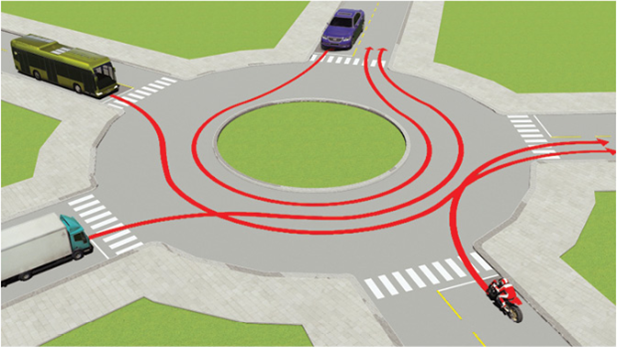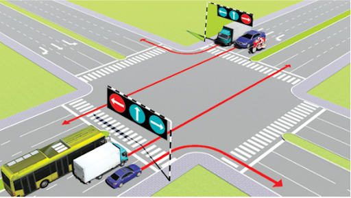 #20. Theo hướng mũi tên, thứ tự các xe đi như thế nào là đúng quy tắc giao thông?
